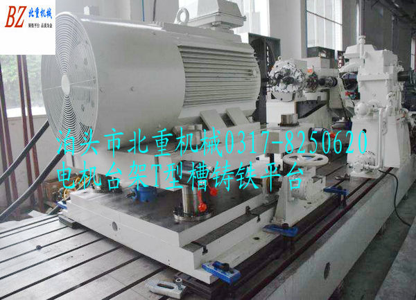 電機台架T型槽鑄鐵平台,T型槽鑄鐵平板工作麵都加工有T型槽,中間距為200mm,一般用28t型螺絲,精度為2級(jí)。這樣的設(shè)計就(jiù)是(shì)為了(le)把電機定位在鑄鐵平台上麵,轉起來試驗,要得到數據等!