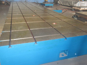 重型鑄鐵平台按GB/4986-85的標準製造,產品製成筋板式和箱體式(shì),工作有長方形,材料(liào)HT200,工作麵采用刮研工藝,工作(zuò)麵上可加V型、T型、U型槽(cáo)和(hé)圓孔、長孔等。平板是用於工件檢(jiǎn)測或劃線的平麵基準器具。平板安裝應調至水平(píng)、負荷均分布於各支(zhī)點上,環境溫度(dù)(20±5℃)使用時應避免振(zhèn)動。